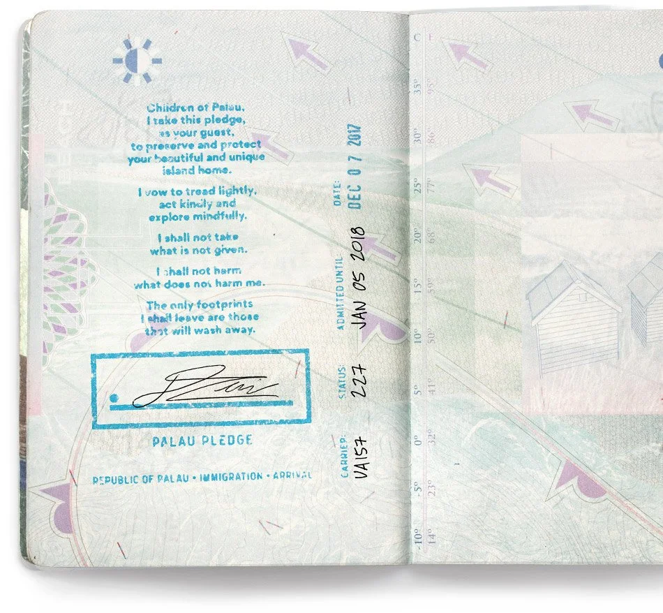 ENLISTING ALLIES - Palau is the first nation on earth to change its immigration laws for the cause of environmental protection. Upon entry, visitors need to sign a passport pledge to uphold a concrete set of actions to protect the nations environment.